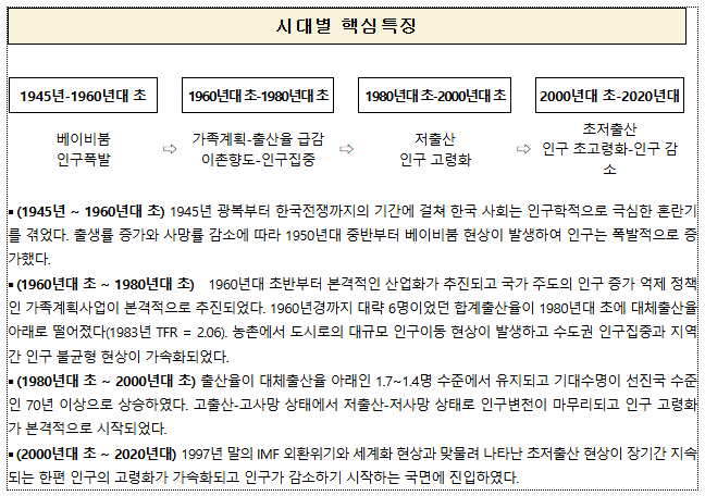 이러한 경제성장과 함께 한국 사회는 큰 변화를 경험하였다. 베이비붐 세대를 거치며 인구가 급증(1950~60년대)했으나, 이후 합계출산율 하락(2024년 0.75명)과 고령인구 증가(2024년 19.5%)로 초저출산·초고령화 상황에 직면해 있다. 한편, 1970년대 농촌에서 도시로 대규모 인구 이동이 이루어지면서 핵가족 위주의 수도권 집중(2024년 50.8%)이 심화되었고, 최근에는 1인 가구(2024년 36.1%) 증가, 결혼·출산 지연 등 인구/가구 구조의 근본적 변화를 겪고 있다.